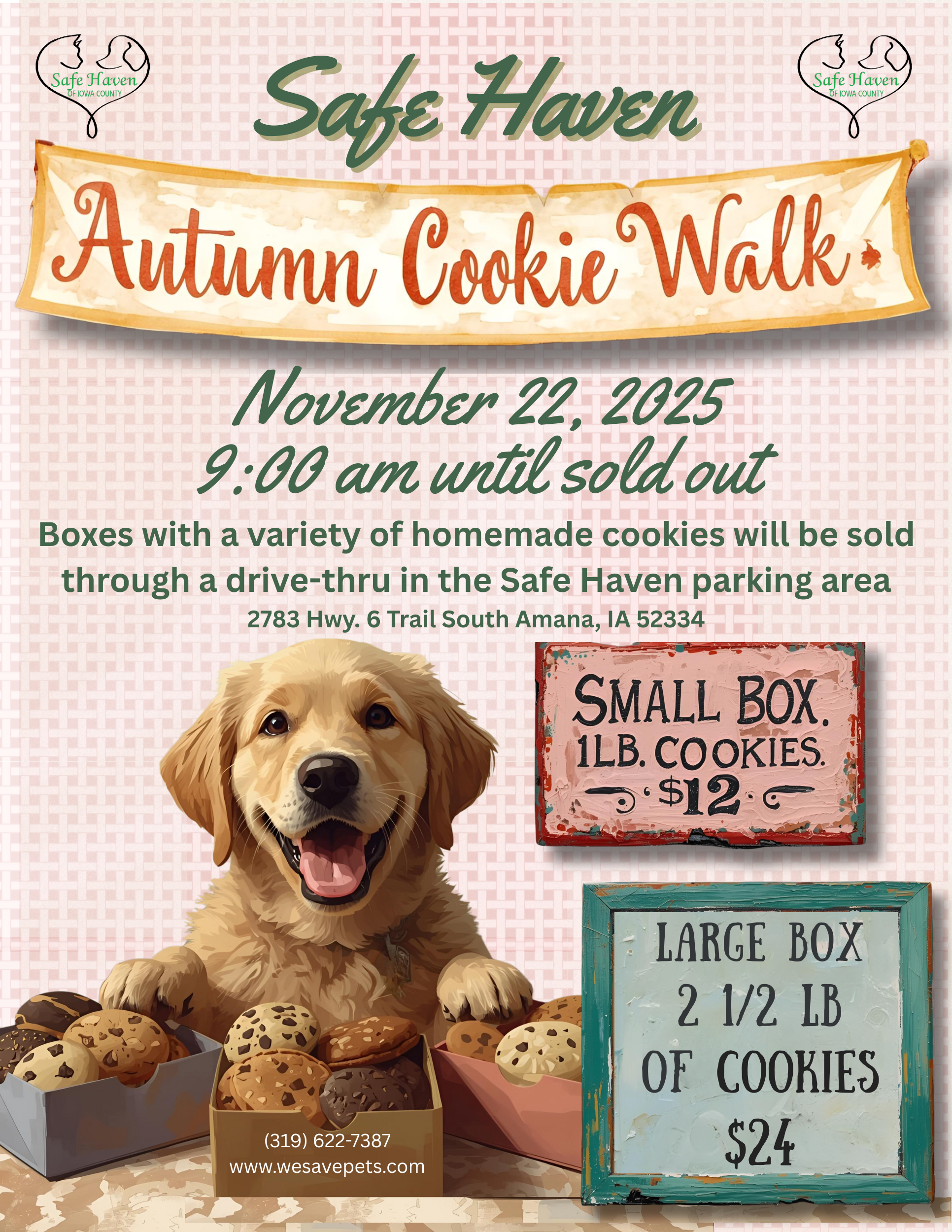 Open Visiting Hours Saturday October 18th, 2025 10:00 AM until 12:00 PM Location: Safe Haven (South Amana) Map: 2783 Highway 6 Trail South Amana IA 52334 We are open this Saturday from 10am to noon to the public. You are welcome to come to Safe Haven to tour the facility and visit with the adoptable animals. Thank you! Open Visiting Hours Saturday October 25th, 2025 10:00 AM until 12:00 PM Location: Safe Haven (South Amana) Map: 2783 Highway 6 Trail South Amana IA 52334 We are open this Saturday from 10am to noon to the public. You are welcome to come to Safe Haven to tour the facility and visit with the adoptable animals. Thank you! Microchip and Vaccine Clinic Sunday October 26th, 2025 9:00 AM until 12:00 PM Location: Safe Haven (South Amana) Map: 2783 Highway 6 Trail South Amana IA 52334