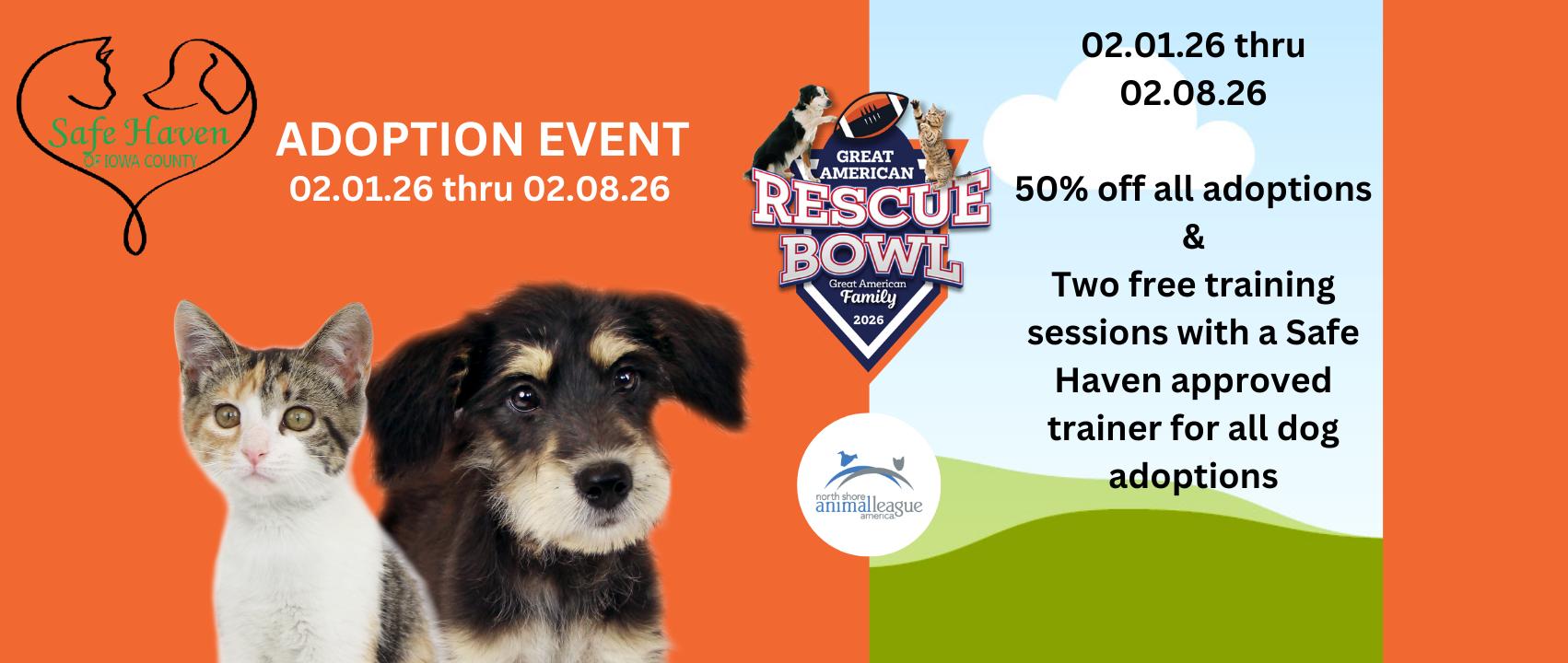 We are open this Saturday from 10am to noon to the public. You are welcome to come to Safe Haven to tour the facility and visit with the adoptable animals. Thank you!